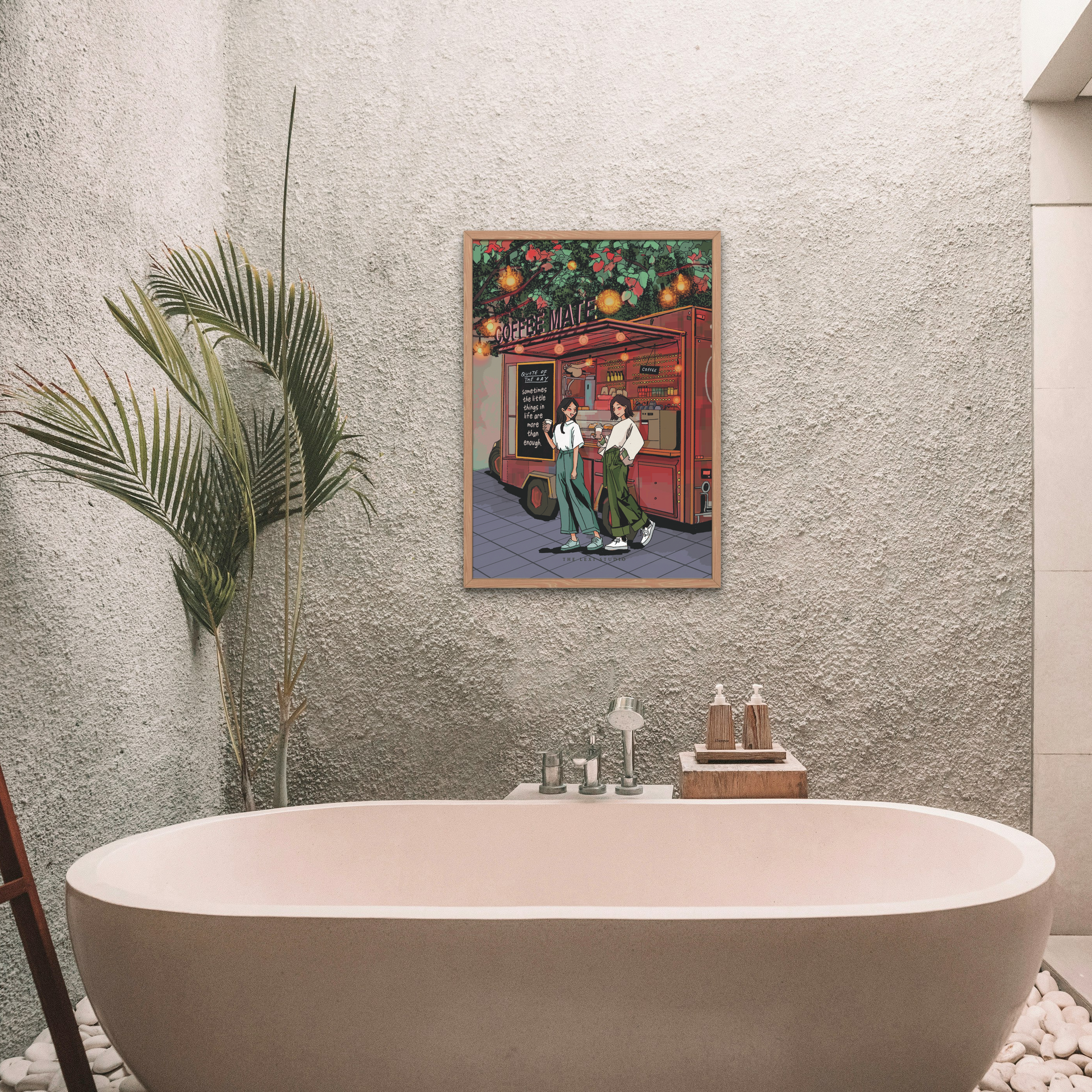 Coffee Mate captures a warm, everyday moment of two girls sharing coffee from a cozy coffee truck. Set in a relaxed, unhurried atmosphere, the illustration celebrates friendship, small rituals, and the comfort found in simple connections. It’s a gentle reminder that happiness often lives in shared conversations, quiet laughter, and taking time to enjoy the present.