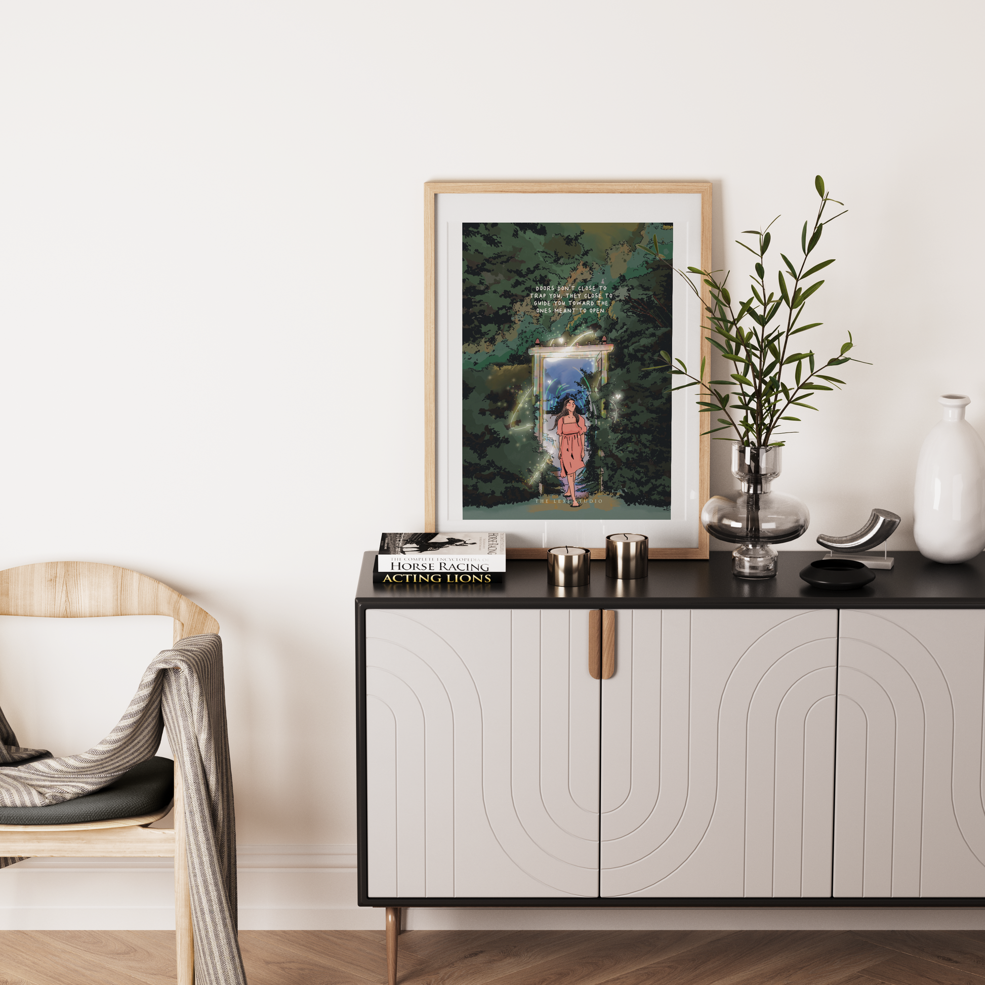 This art print reflects on the gentle wisdom of life’s transitions. Through evocative imagery, it reminds us that endings are not barriers but guides, steering us toward new opportunities and the doors meant to open. A contemplative piece that celebrates trust, timing, and the unfolding path of personal growth.