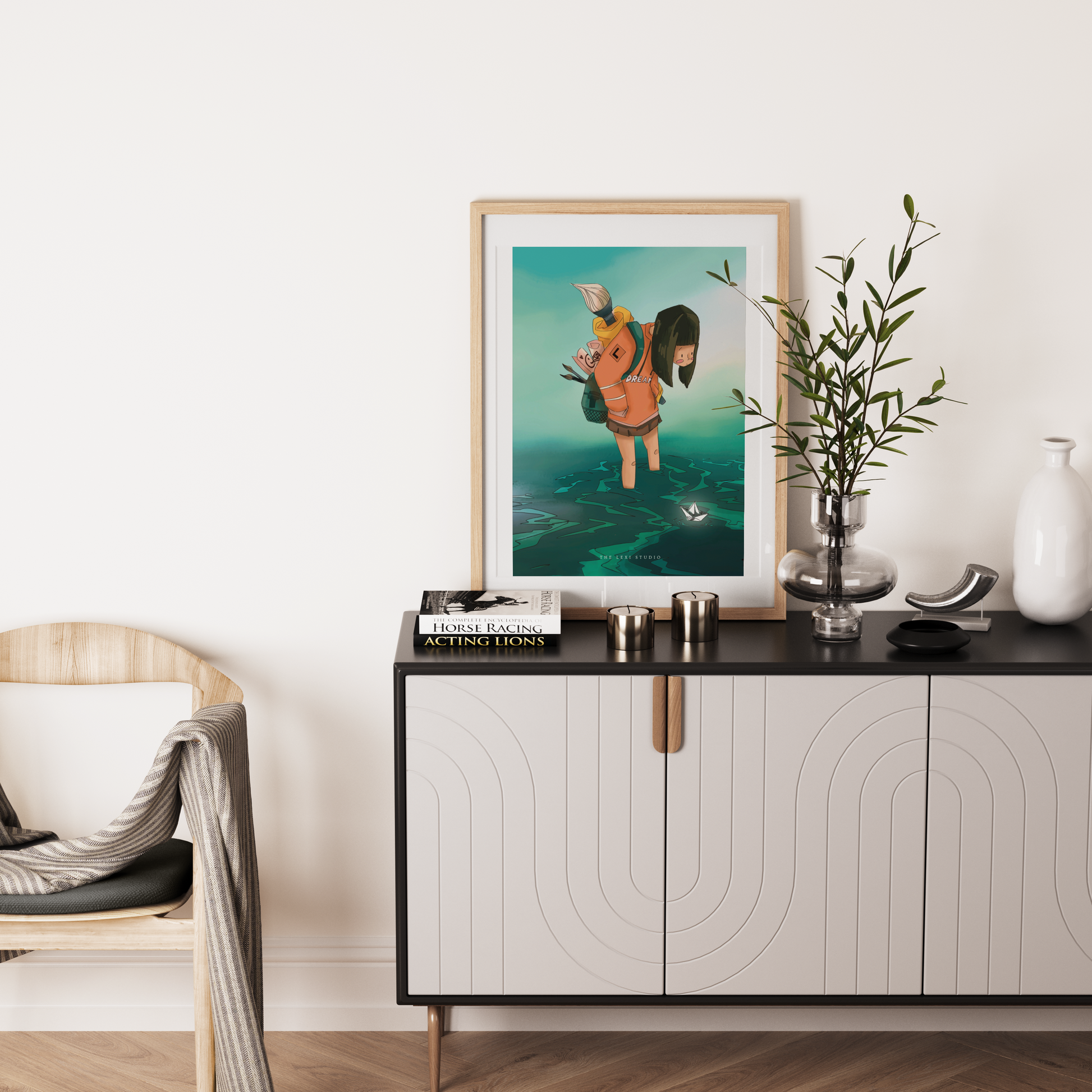 This art print captures a whimsical, inspiring moment of a girl encountering a floating boat, with her art supplies on her back. The scene evokes curiosity, creativity, and the joy of discovery, celebrating the magic that appears when we carry our passions with us. A gentle reminder to explore, create, and follow where inspiration leads.