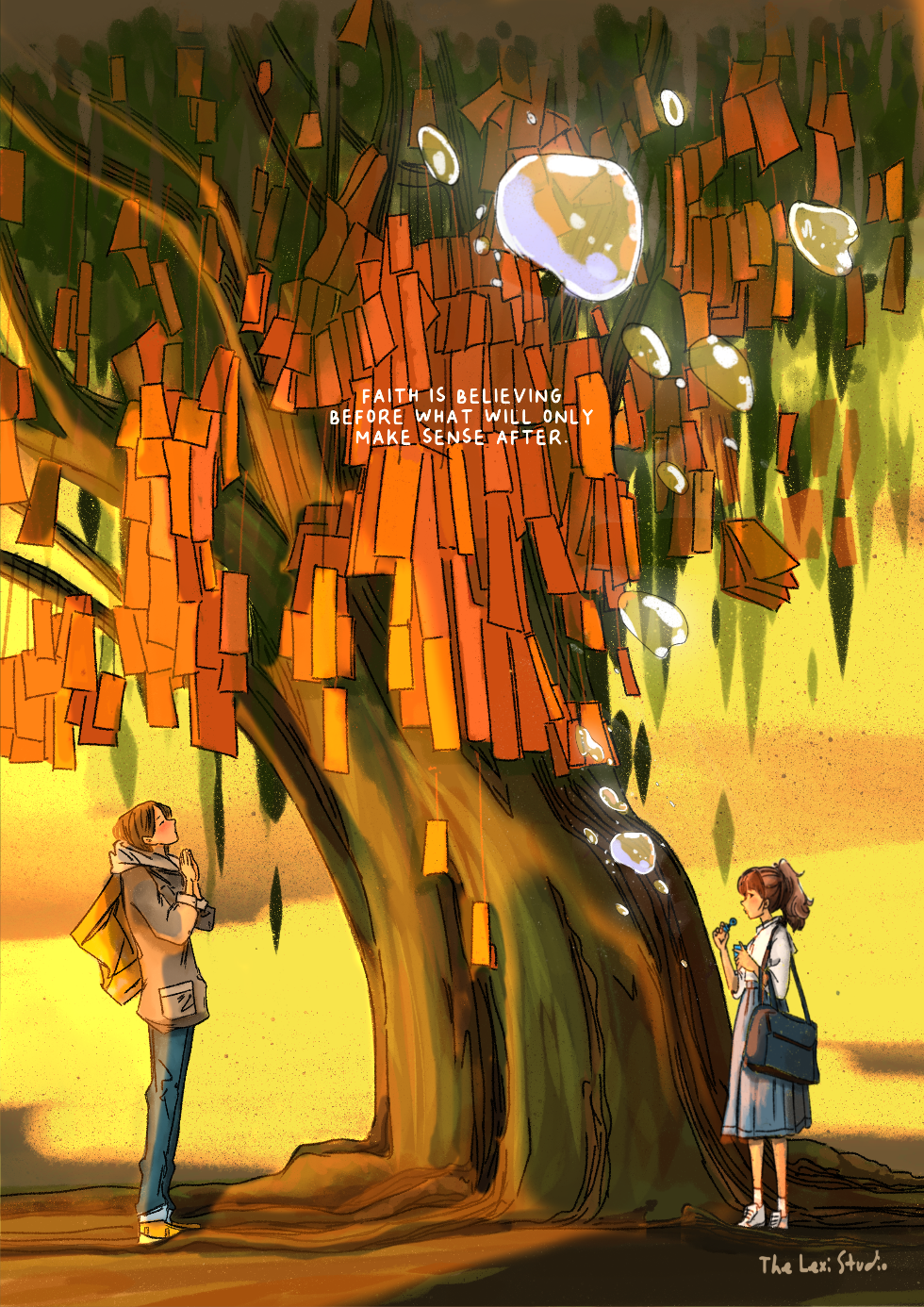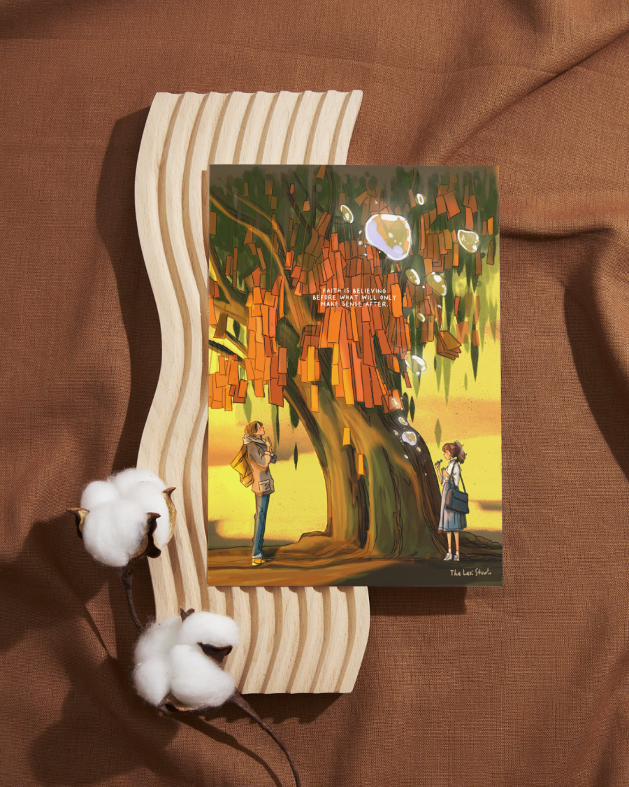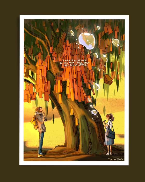 Beneath the branches of a mystical wishing tree, we place our trust in faith—a quiet, invisible power that believes in what will only make sense after. Around us, delicate bubbles drift into the air, carrying dreams and hopes beyond sight. This art print captures the essence of The Invisible World, where unseen forces guide us, connect us, and inspire us to dream beyond the tangible. It’s a gentle reminder to trust the journey, embrace the unknown, and have faith in the beauty waiting to unfold.